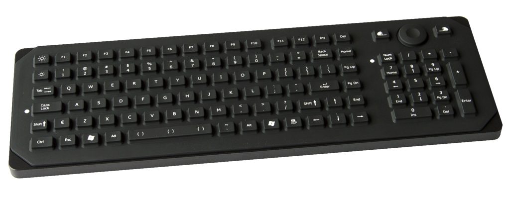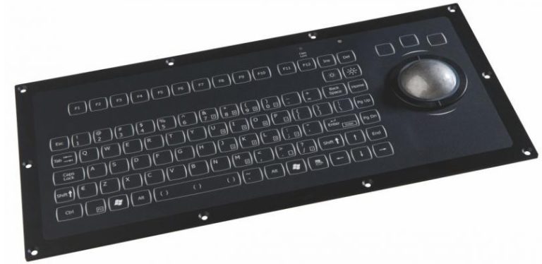 Rugged keyboard features a compact full Mulifunction keyboard with integrated number pad and a large 50mm laser trackball with removable ball.